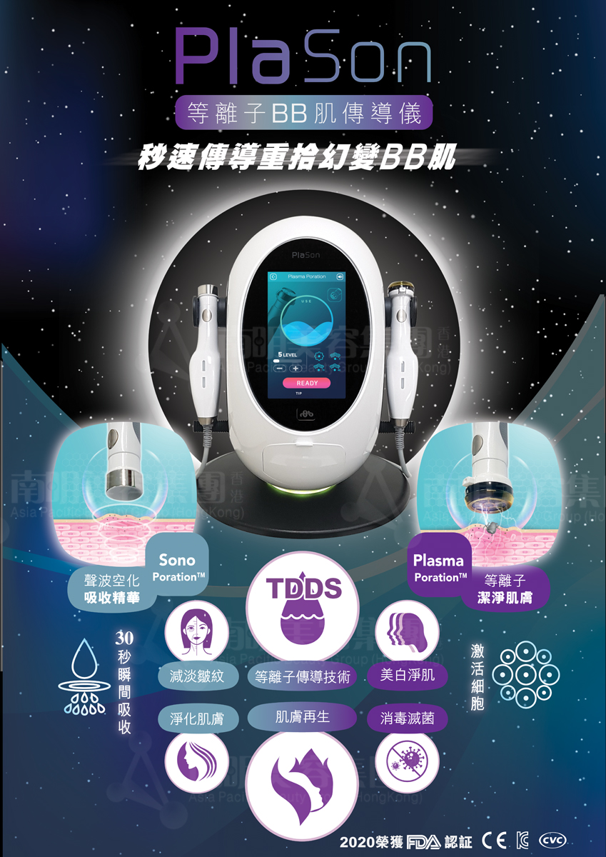 PlaSon 等離子BB肌傳導儀 秒速傳導幻變水亮BB肌!PlaSon革命性導入技術將養份深入滲透「細胞牆」,讓肌膚吸飽精華,水潤亮澤,十足初生BB肌!PlasmaPoration™專利探頭,透過TDDS等離子傳導技術,以30秒高速將養份直送肌底;SonoPoration™穩定的空化作用,增加細胞吸收和精華滲透,讓細胞完整吸收養份,重拾初生嫩肌。