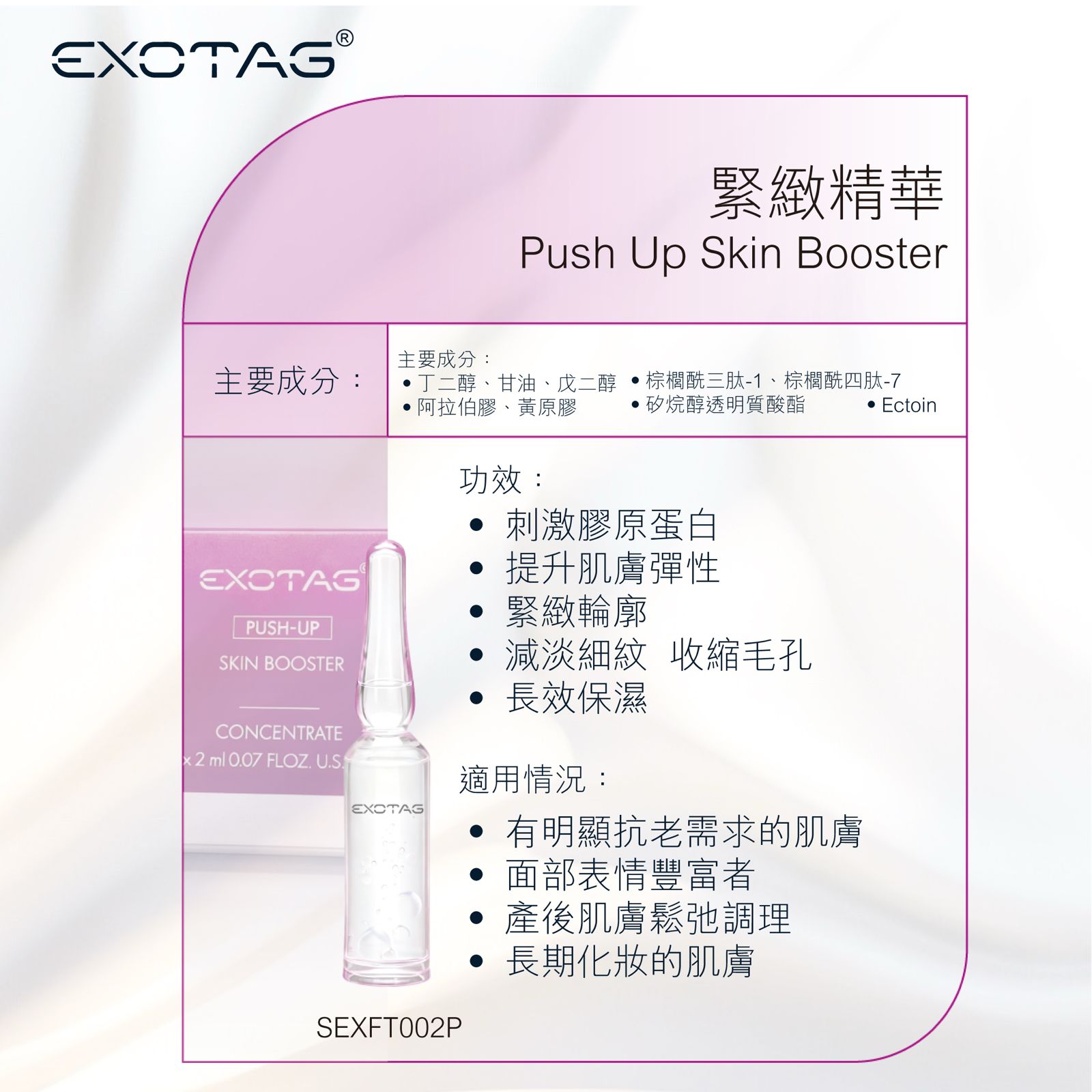 EXOTAG緊緻精華一款針對抗老需求設計的多效精華,透過刺激膠原蛋白生成,提升肌膚彈性、緊緻輪廓,並能減淡細紋、收縮毛孔,同時具備長效保濕效果,適合面部表情豐富、產後鬆弛或長期化妝的肌膚。