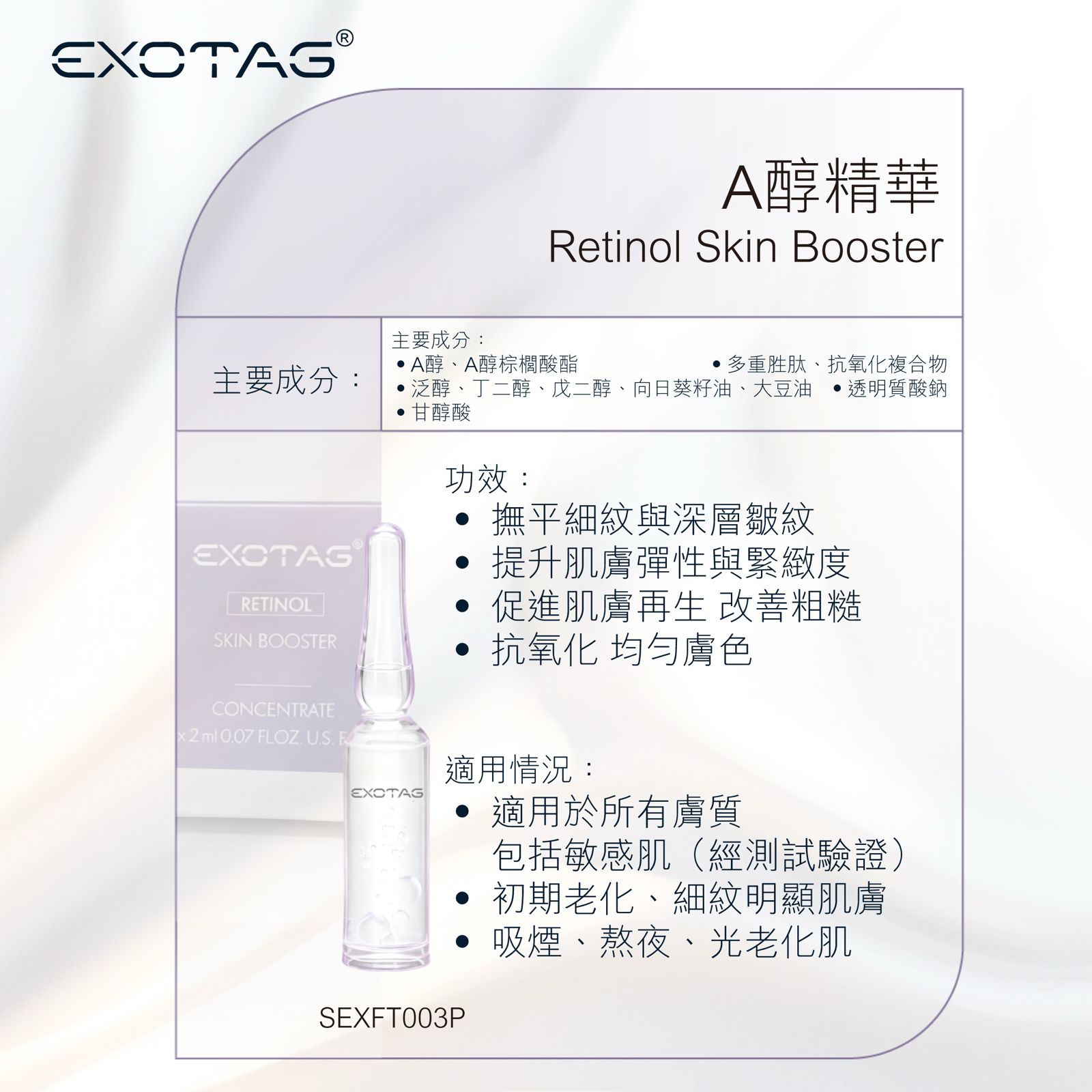 EXOTAG A醇精華採用A醇與其衍生物為核心的抗老精華,能有效撫平細紋與深層皺紋,提升肌膚彈性與緊緻度,促進肌膚再生並改善粗糙,同時具備抗氧化與均勻膚色功效,經測試亦適合敏感肌使用。