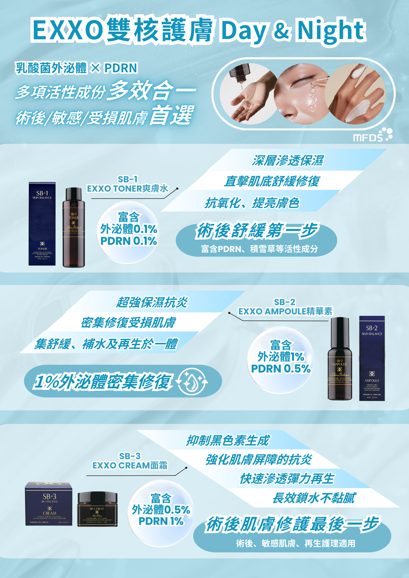 EXXO 雙核護膚系列,以革命性「乳酸菌外泌體」結合「Derbiome® L-PDRN」雙核修護科技為核心,專為術後、敏感及受損肌膚設計。系列涵蓋爽膚水、精華素、面霜,從舒緩、修復到強韌屏障,提供日夜不間斷的密集護理,幫助肌膚釋放年輕進化力量,恢復健康穩定狀態。