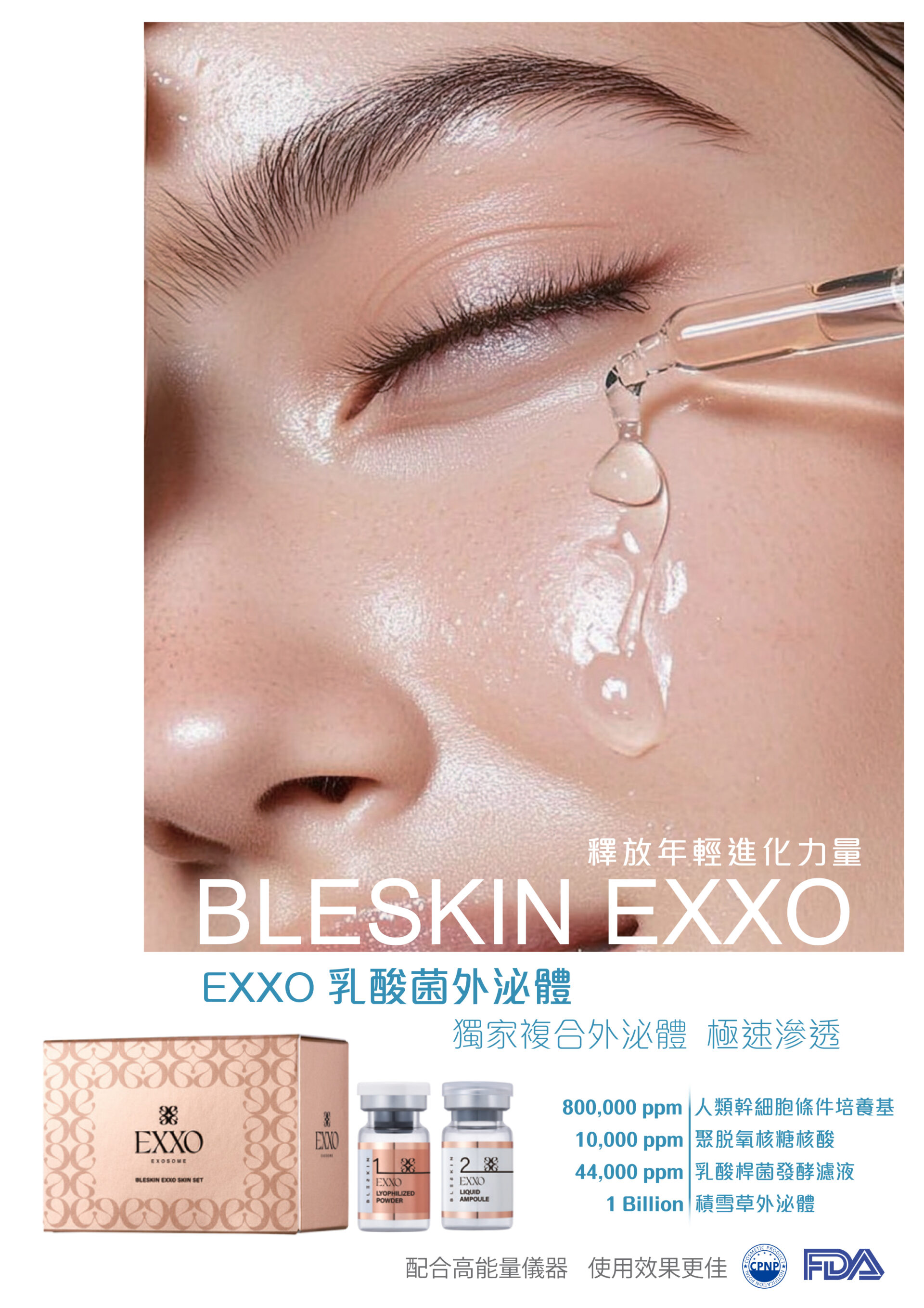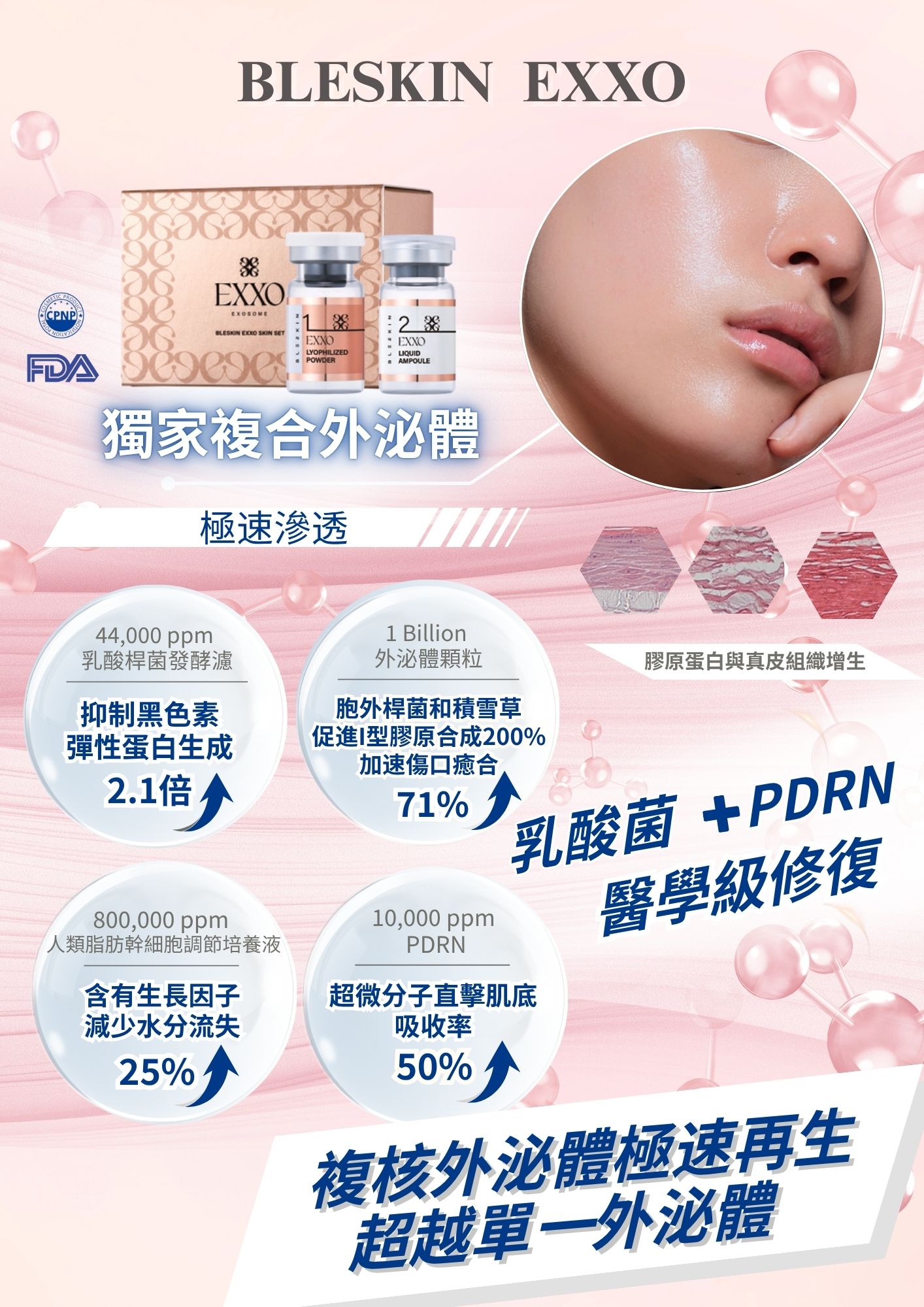 極速滲透・煥活肌底 EXXO 乳酸菌外泌體,融合獨家複合外泌體科技,以極微分子滲透肌膚底層,帶來前所未有的護膚體驗。產品精選多種高效活性成分,包括 44,000 ppm 乳酸桿菌發酵濾液10,000 ppm PDRN,以及高達 1Billion 外泌體顆粒等,實現極致修護、強效保濕、舒緩煥亮與細胞再生。